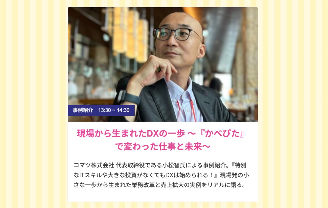 当社の代表取締役 小松智は、「現場から生まれたDXの一歩 ~『かべぴた』で変わった仕事と未来~」と題して、当日13時30分からのセミナープログラムに登壇いたします。